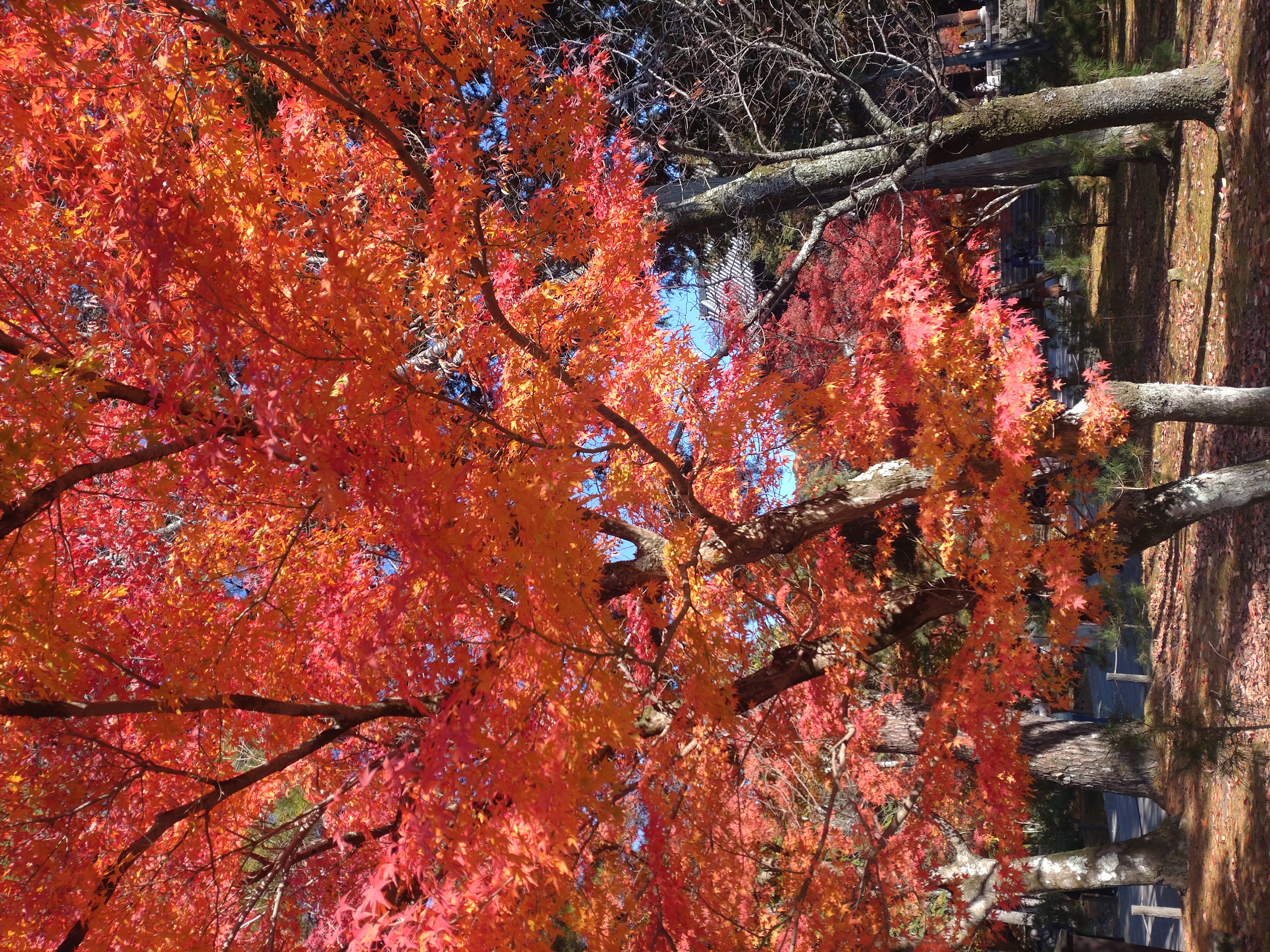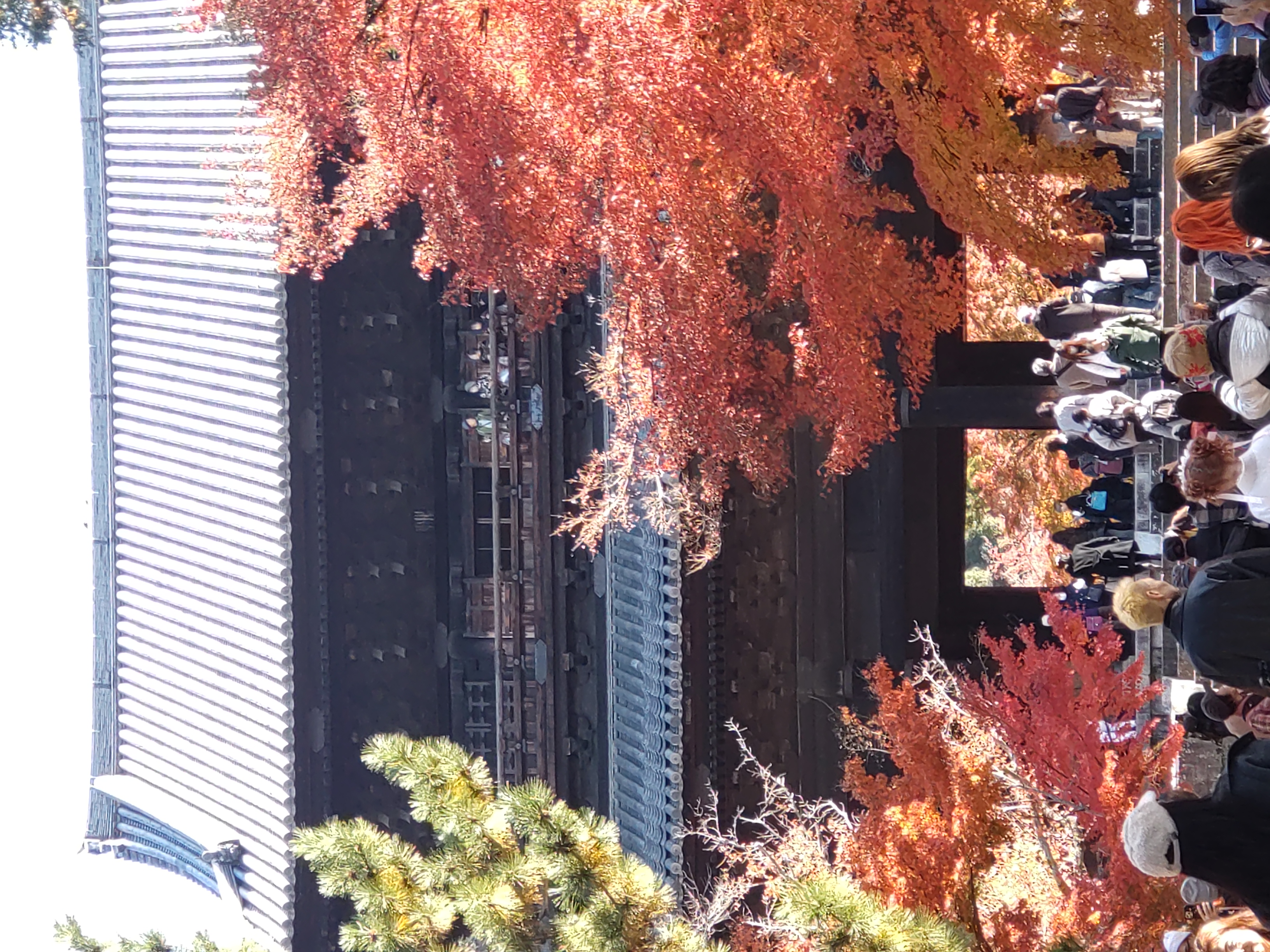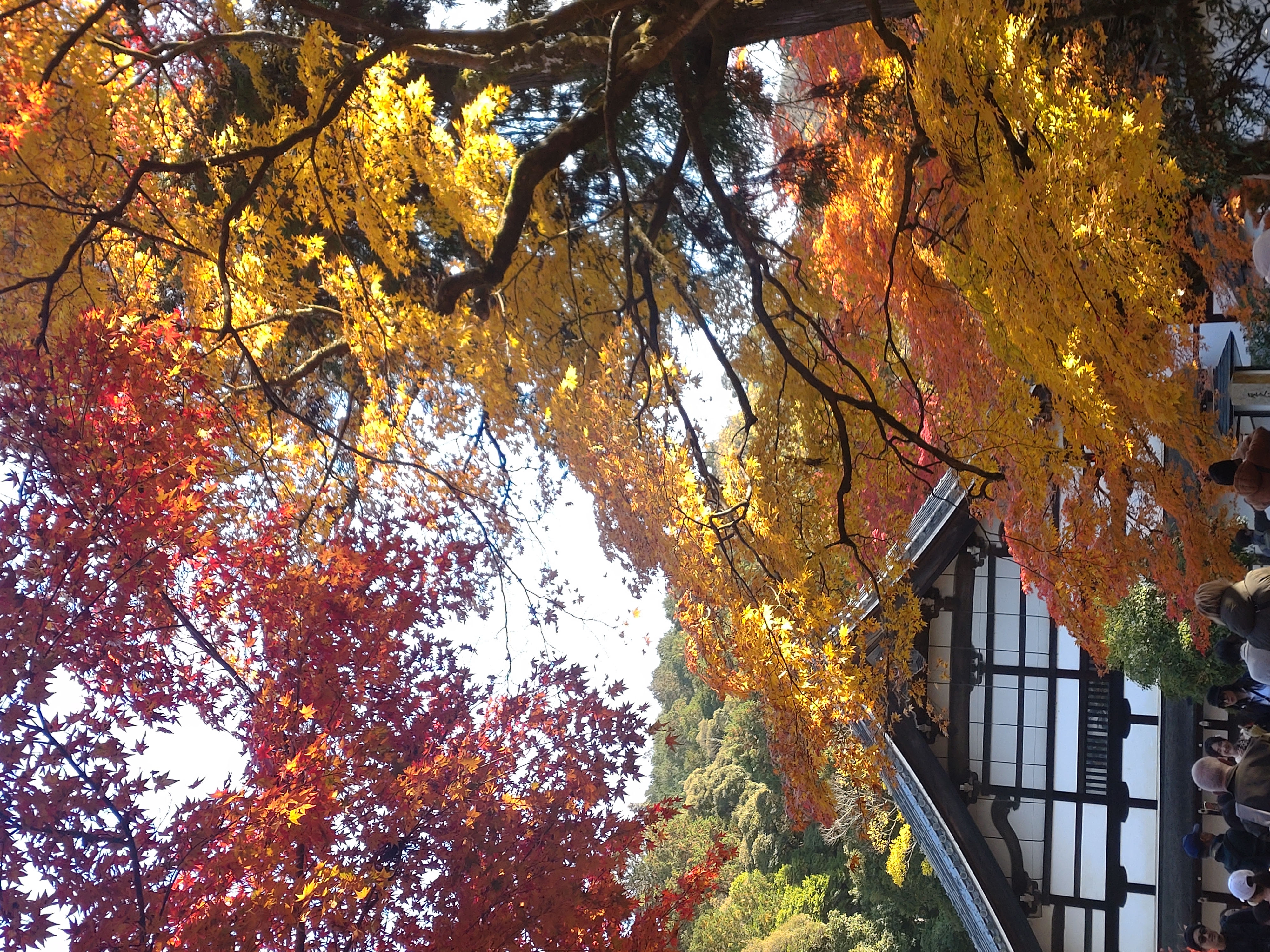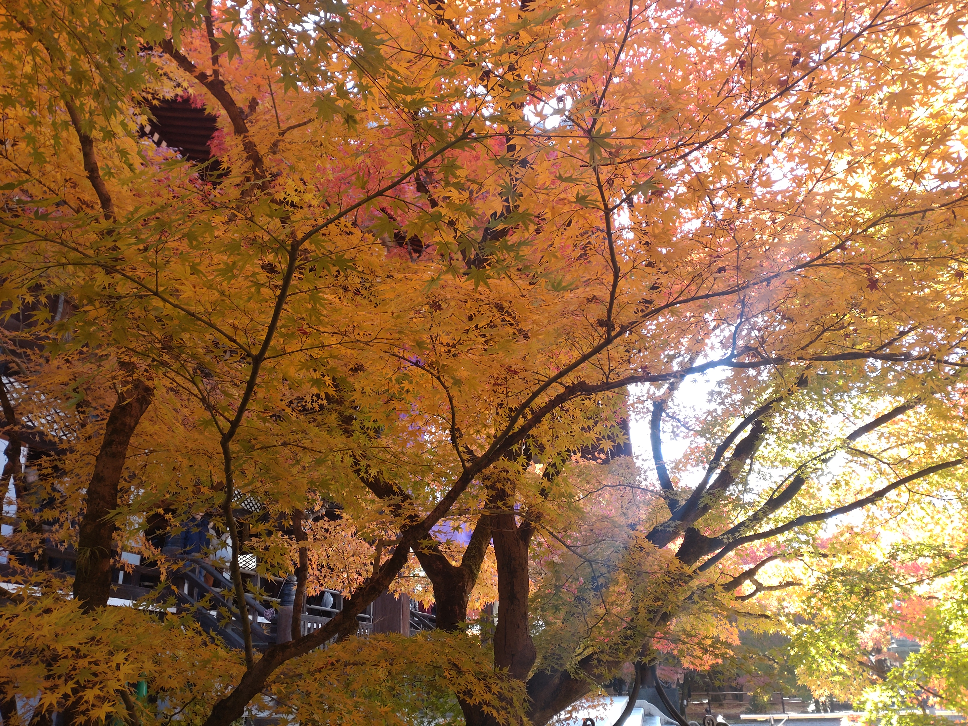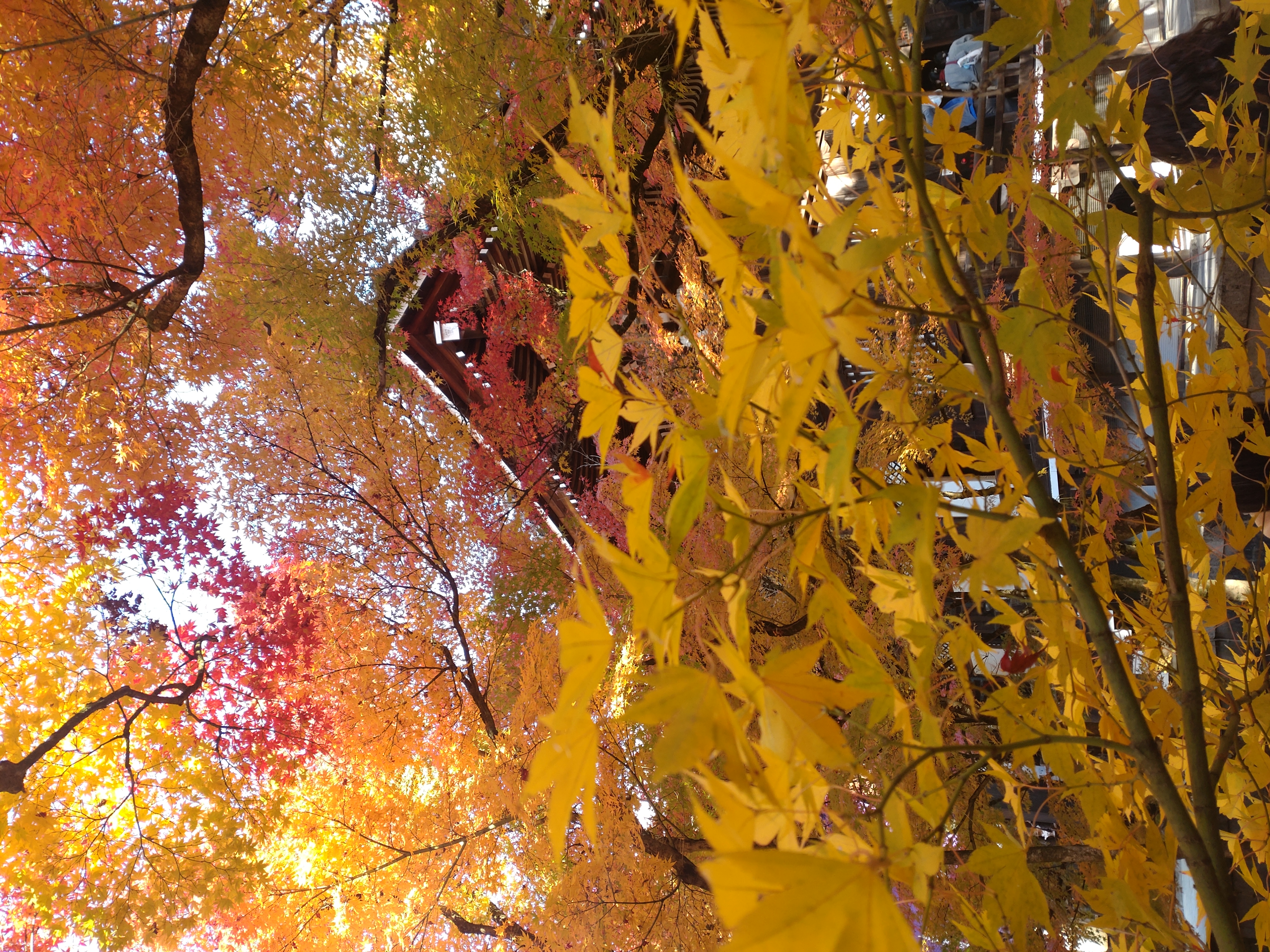 境内の奥にある多宝塔に上る道がよい撮影スポットで、御影堂(大殿)を背景に多彩な錦秋の色彩が溢れるばかりです。