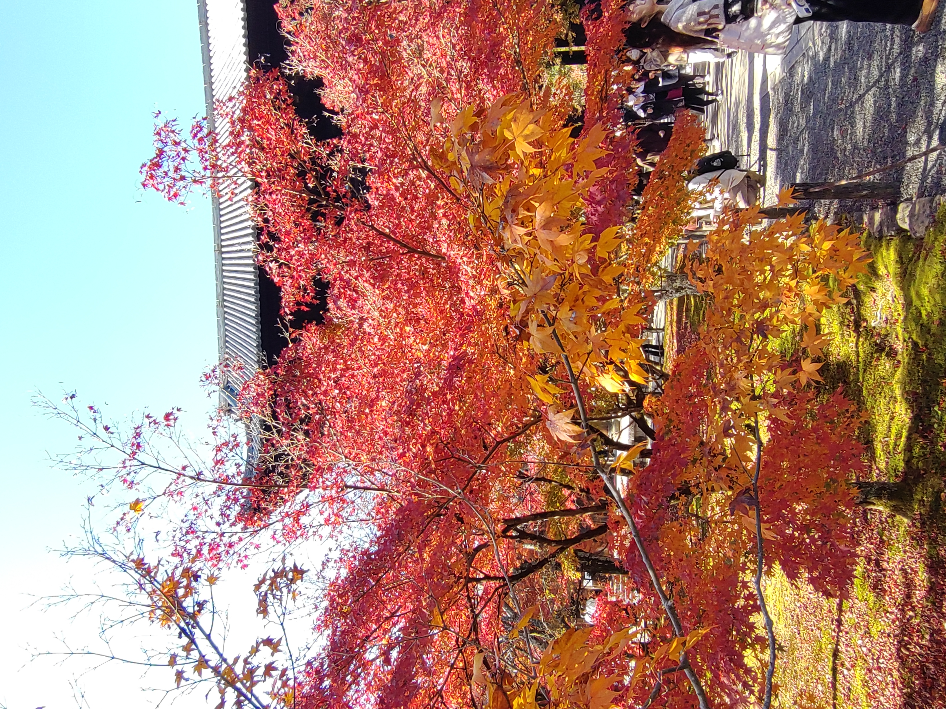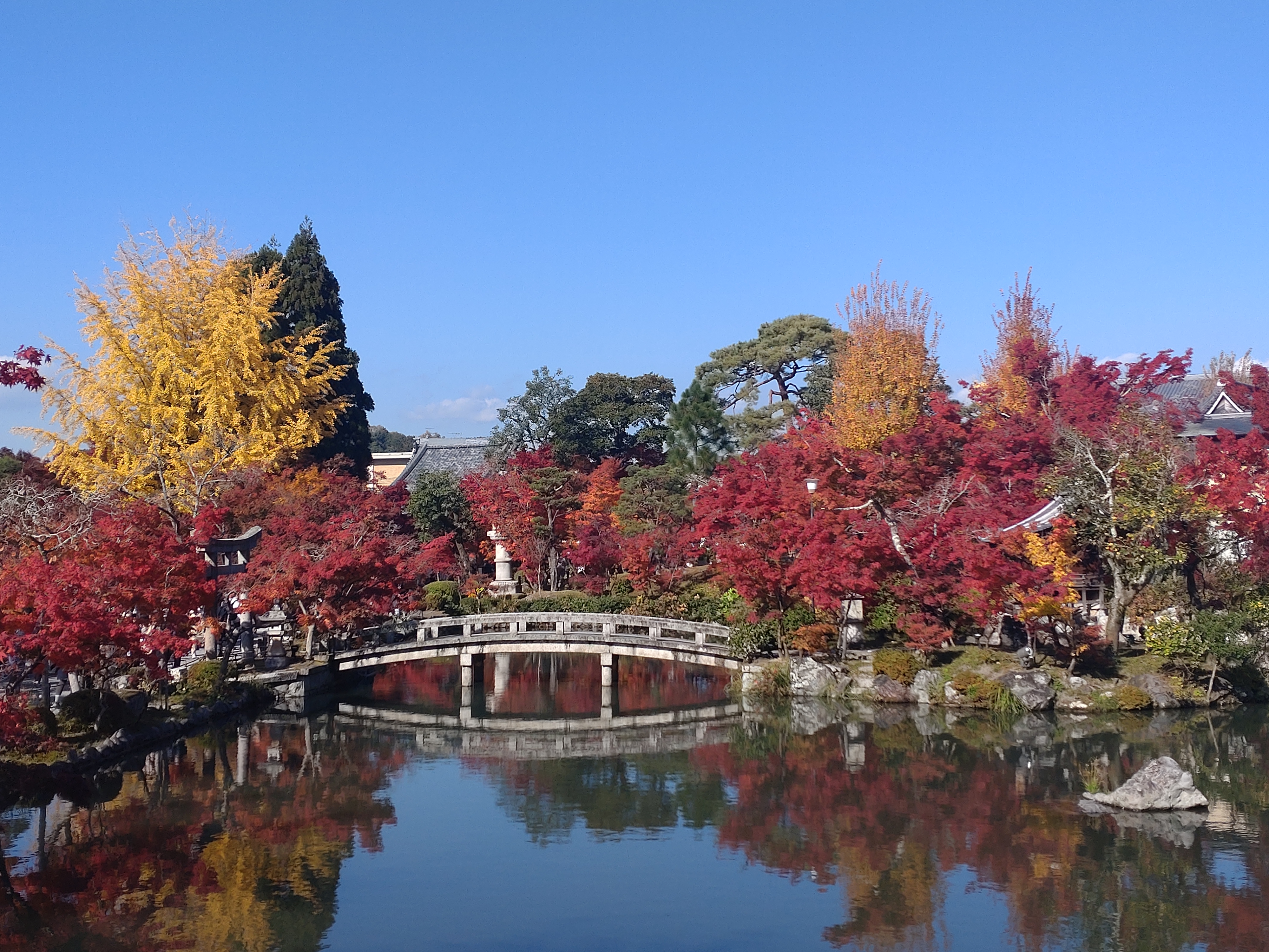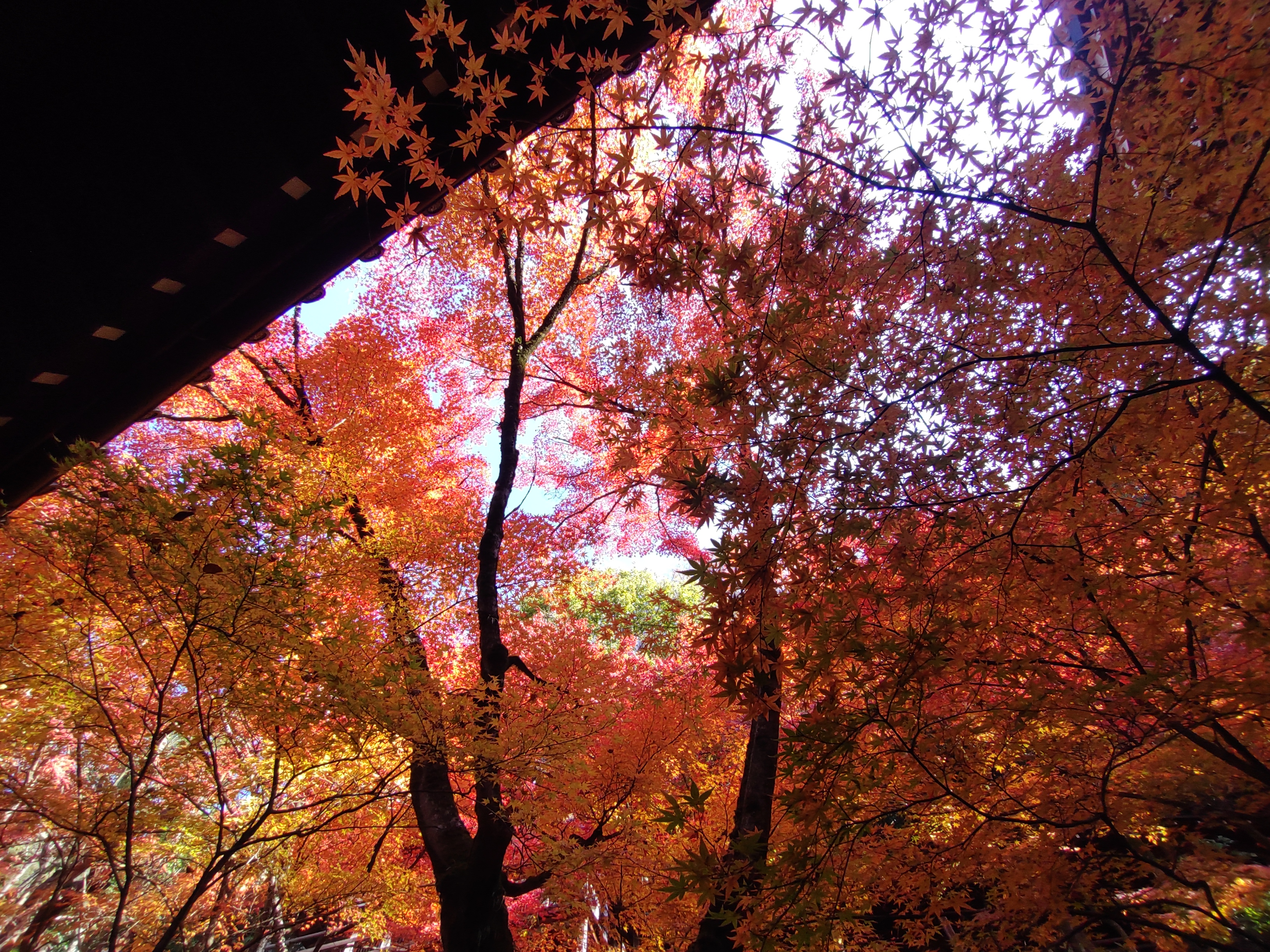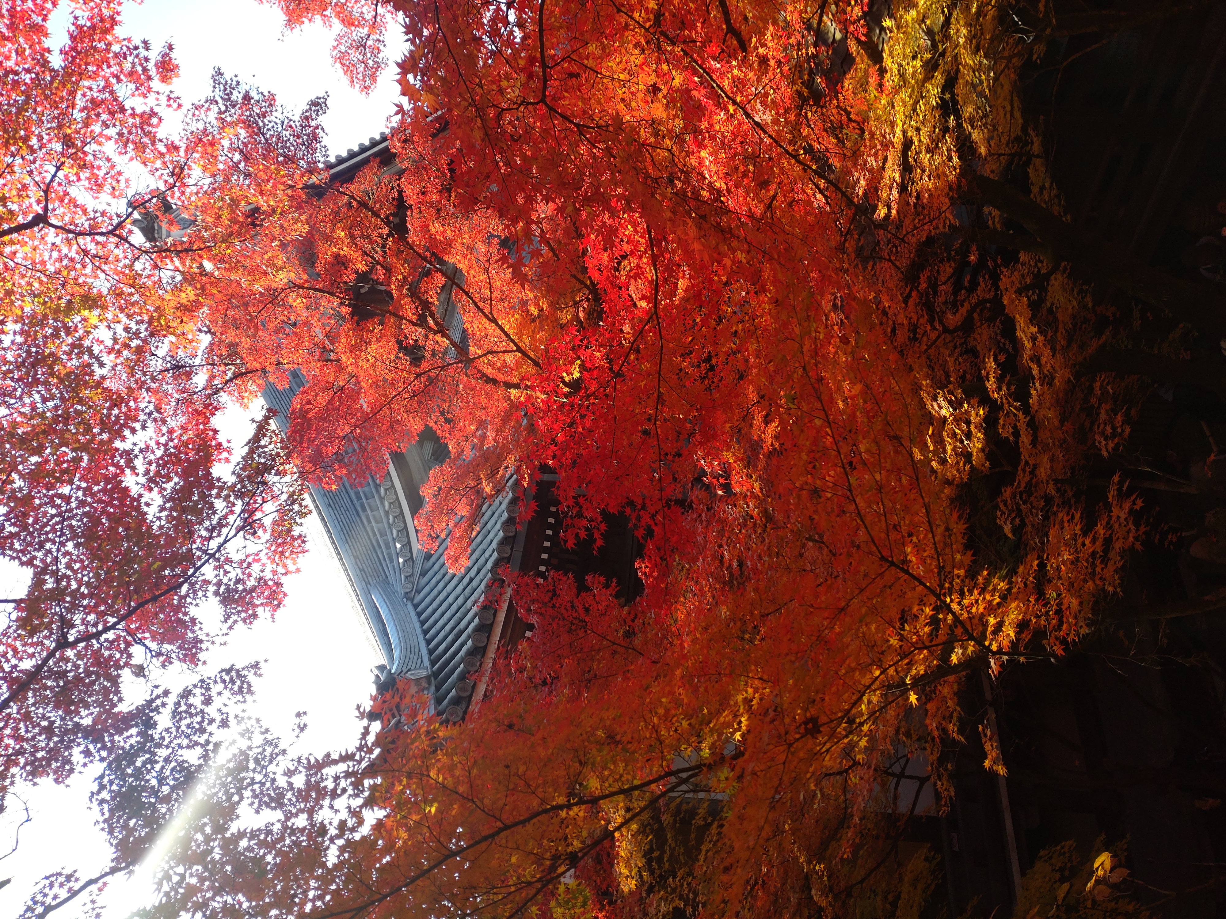 南禅寺から10分も歩けば永観堂禅林寺。古くからの名所であり、京都でも群を抜く3000本に上るイロハモミジやオオモミジがある永観堂は、境内のあちこちに見どころがあり、色彩多彩でグラデーション豊富です。抜けるような青空の下で見ると赤の鮮やかさが一段と引き立ちます。