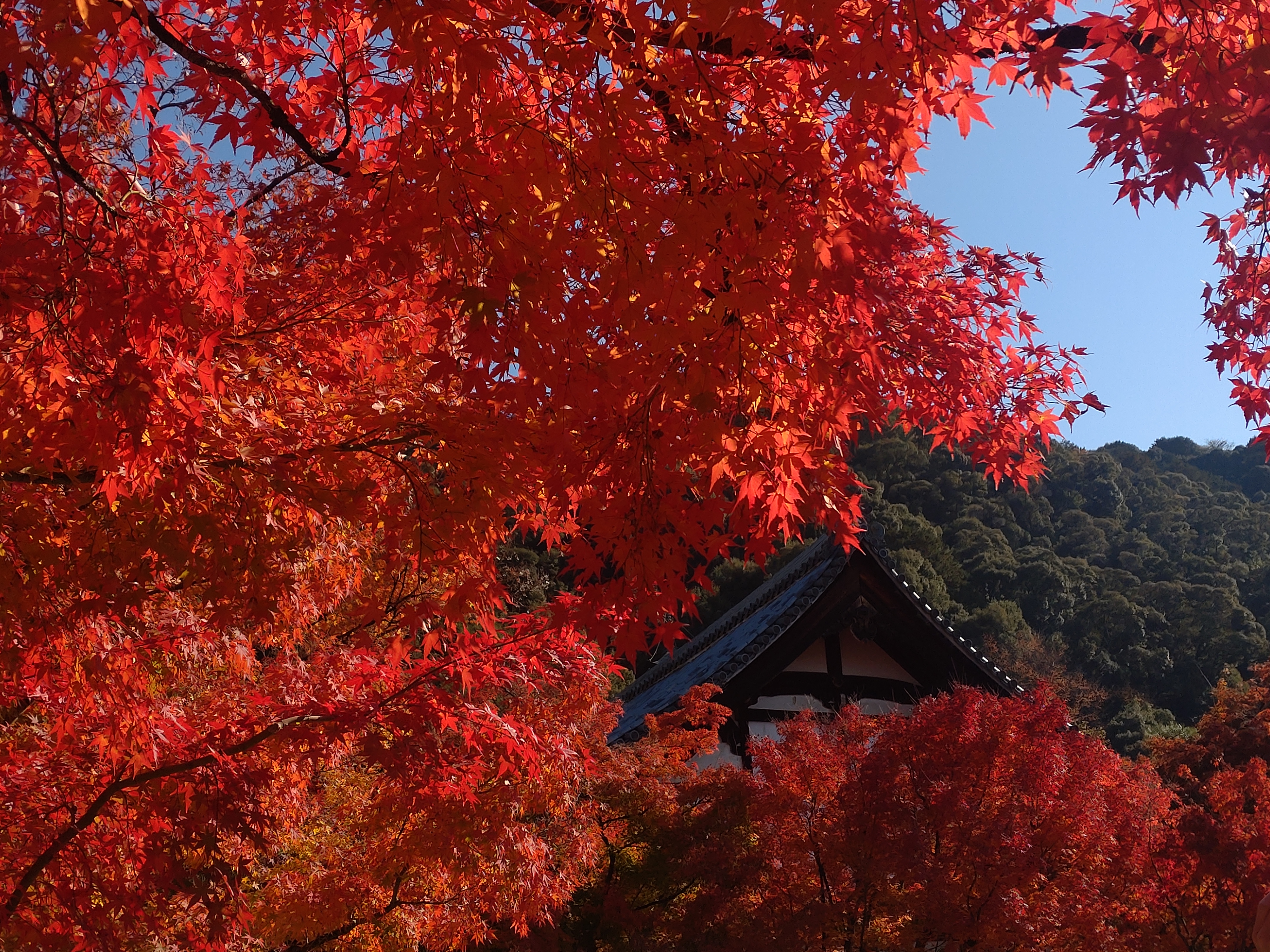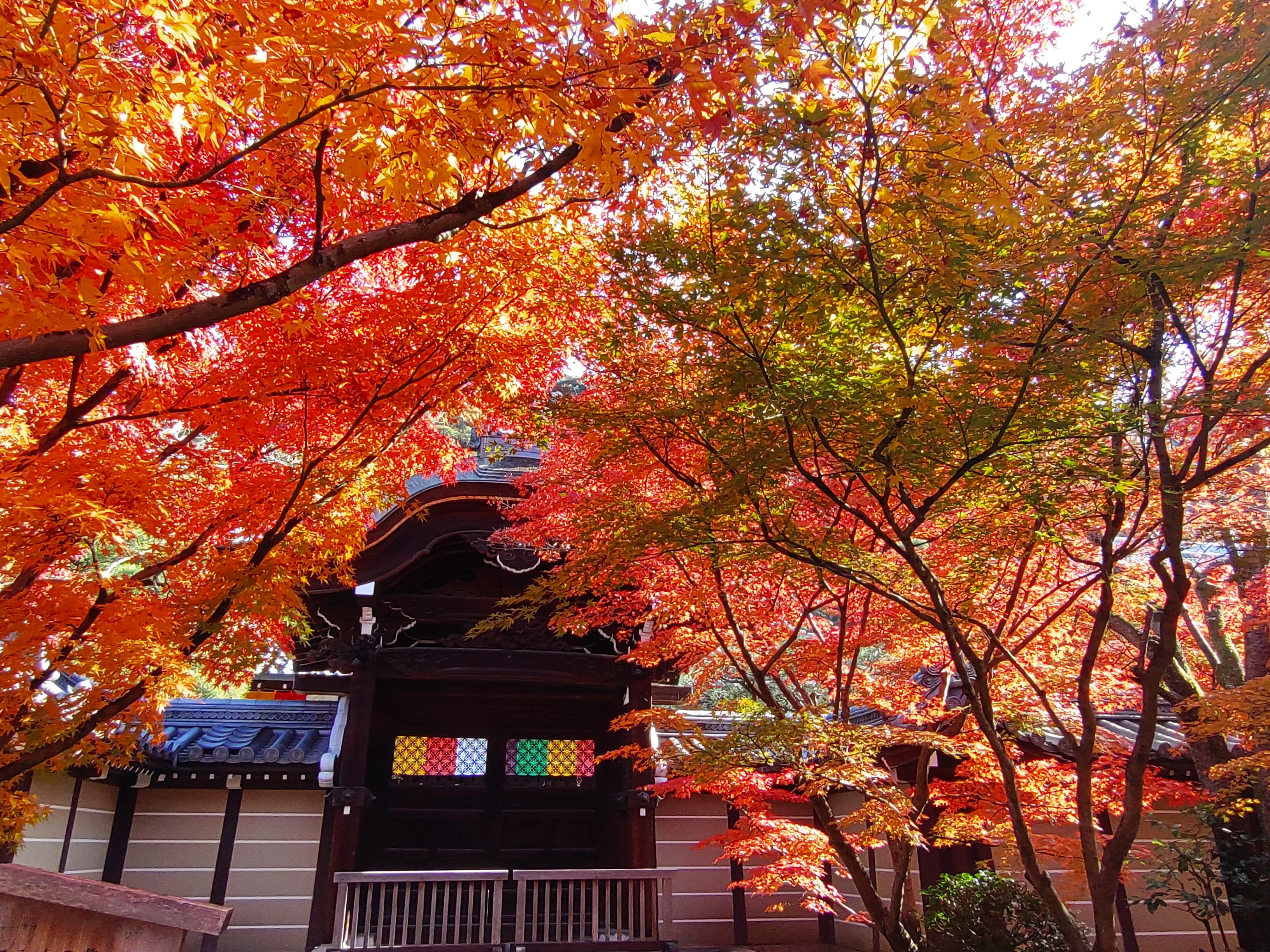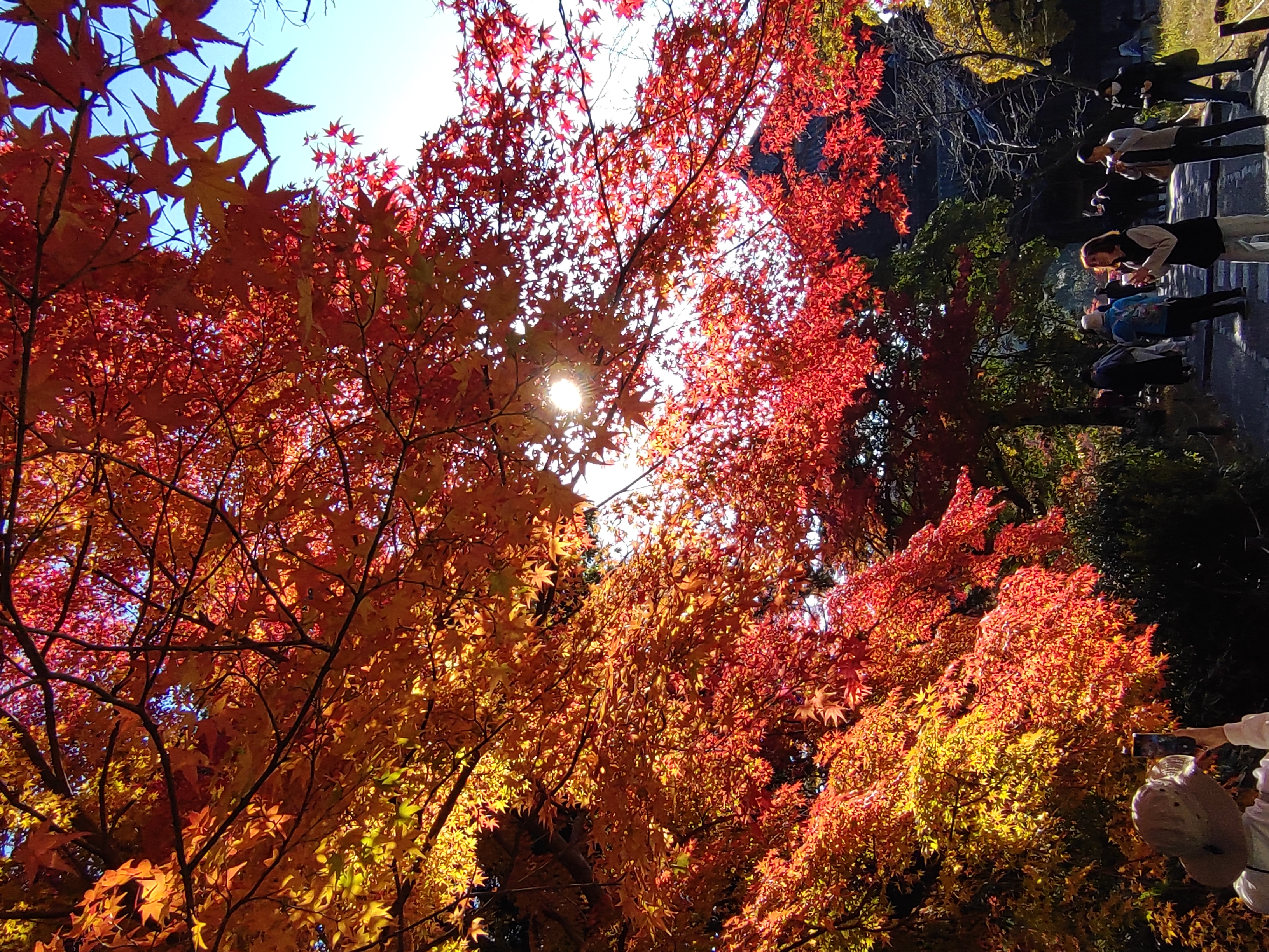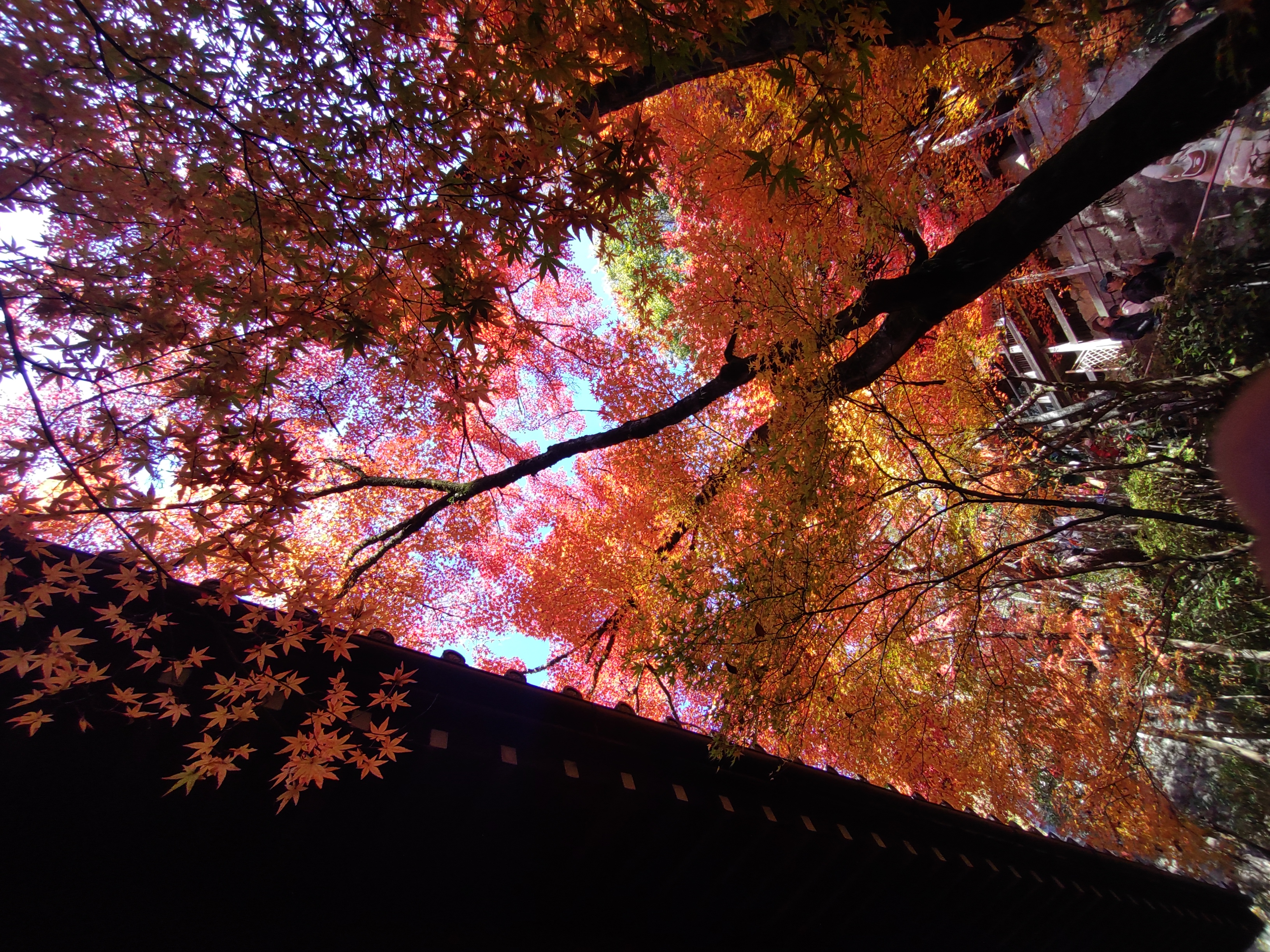 南禅寺から10分も歩けば永観堂禅林寺。古くからの名所であり、京都でも群を抜く3000本に上るイロハモミジやオオモミジがある永観堂は、境内のあちこちに見どころがあり、色彩多彩でグラデーション豊富です。抜けるような青空の下で見ると赤の鮮やかさが一段と引き立ちます。