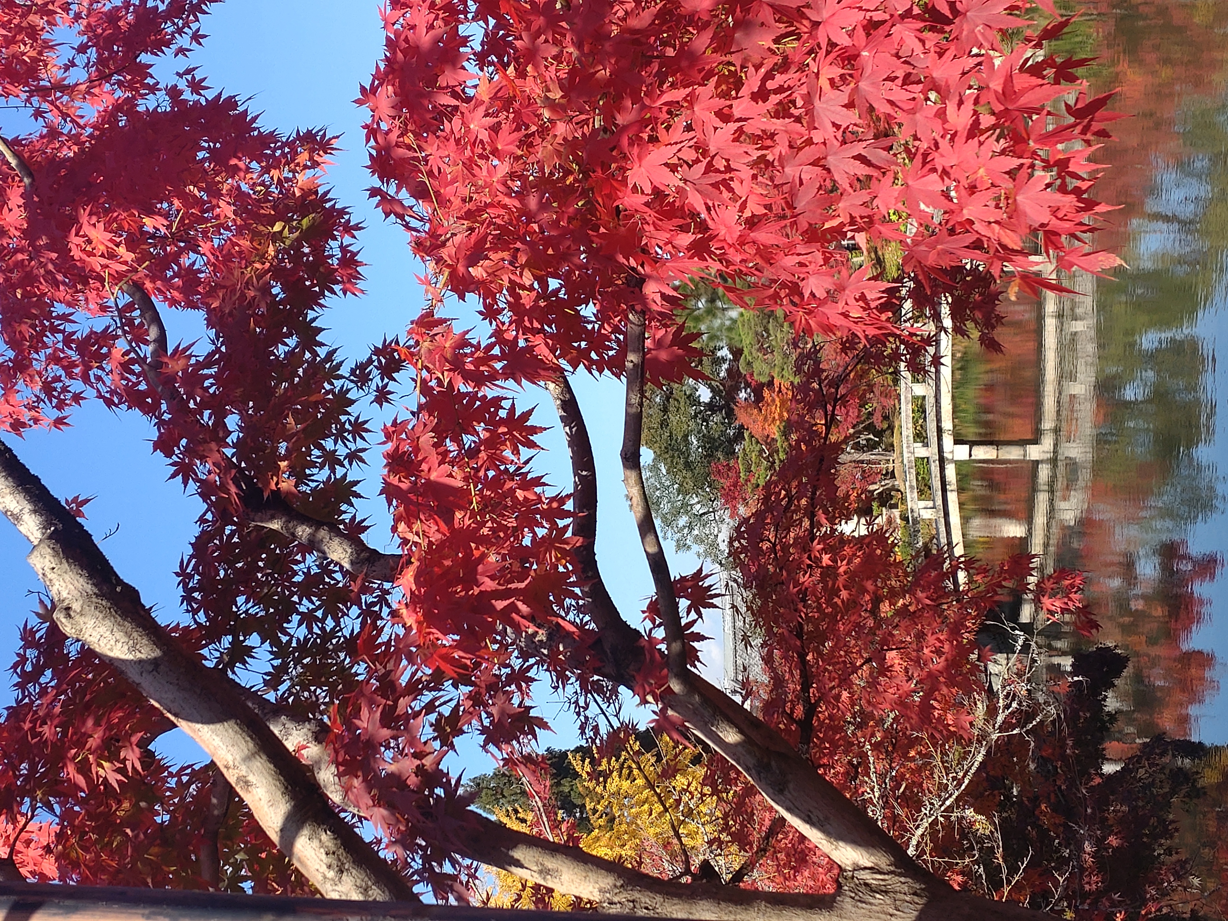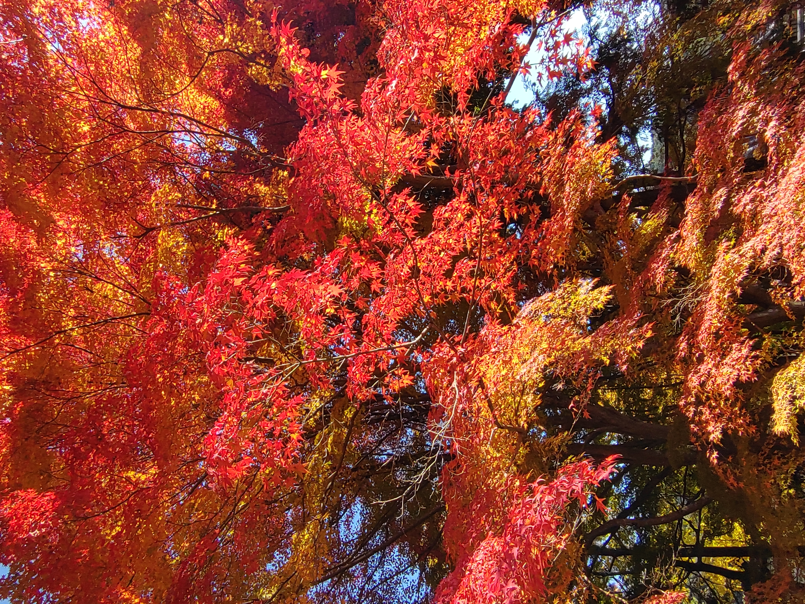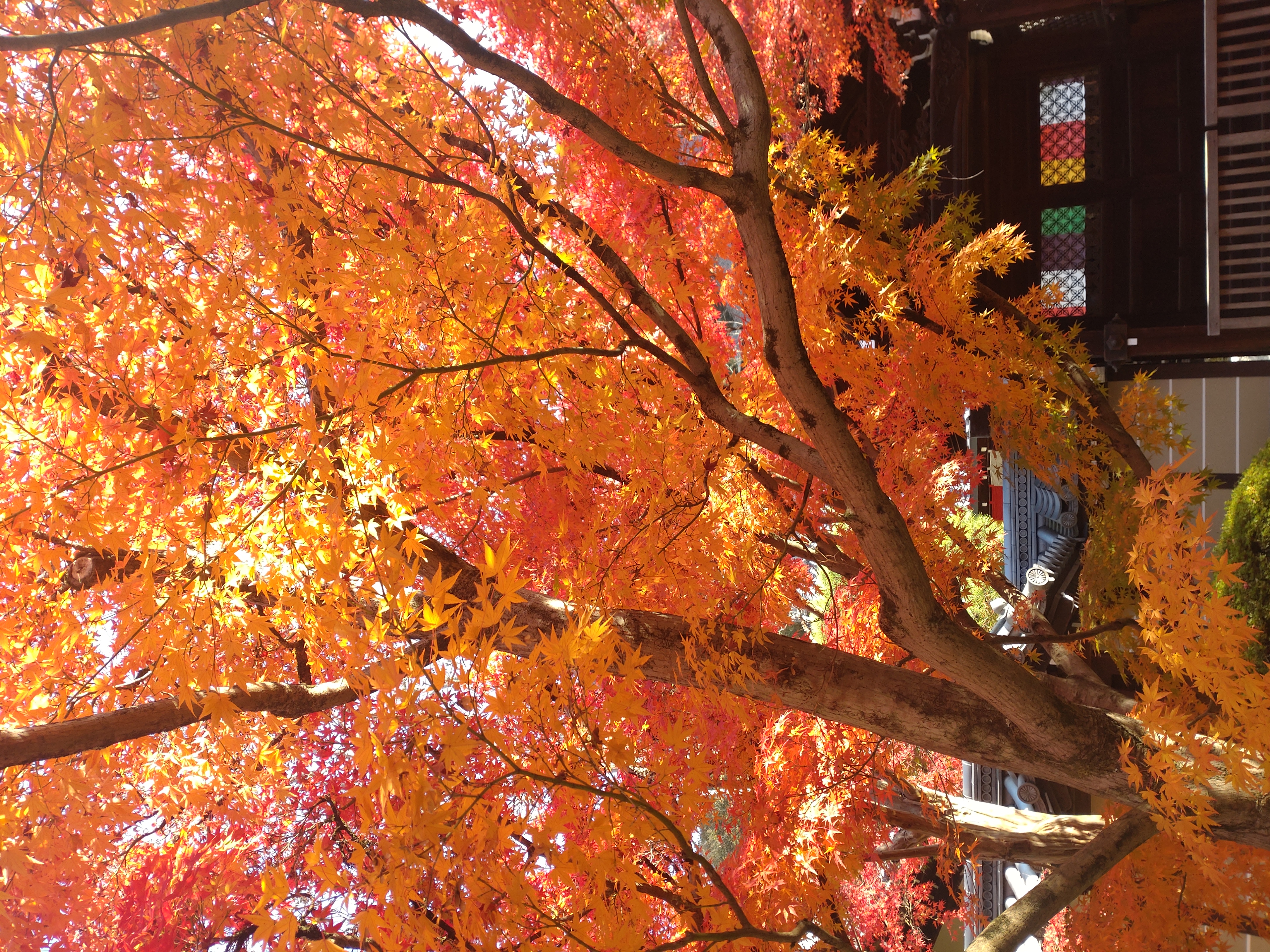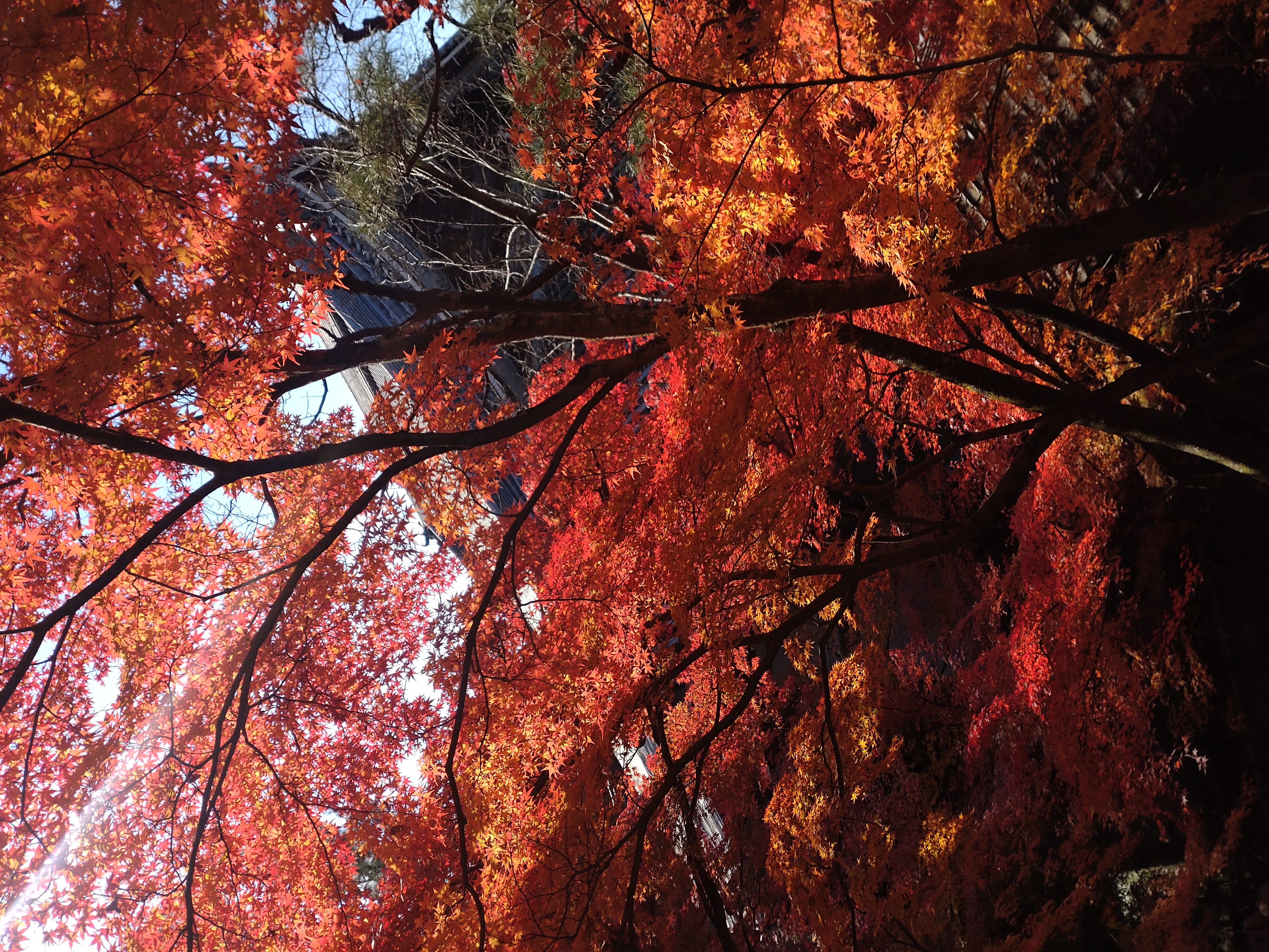 南禅寺から10分も歩けば永観堂禅林寺。古くからの名所であり、京都でも群を抜く3000本に上るイロハモミジやオオモミジがある永観堂は、境内のあちこちに見どころがあり、色彩多彩でグラデーション豊富です。抜けるような青空の下で見ると赤の鮮やかさが一段と引き立ちます。