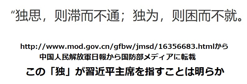 「独思、即滞而不通;独為、即困而不就」は漢字を知る日本人なら容易に理解できます。「一人で思い、一人で為すだけでは駄目ですよ、習近平さん」と言っています。「独」とはまさしく習近平です。習近平思想崇拝時代には考えられない表現です。