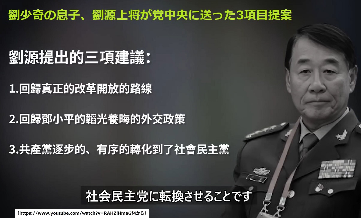ユーチューブの《精鋭論壇: 2代目国家主席劉少奇の息子である劉源が、最近中央に書簡を送り、国家の方向性の変更を求めたとのことです》から画面を引用します。オーストラリア在住の袁教授の解説で、劉源上将が市場経済の原則に反した政策が現在の困難な経済状況を引き起こし、もし1950年代後半のように数千万人の餓死者を出すことにでもなれば共産党への支持はもう期待できないと考えていると伝えています。3項目の提案は(1)真の改革開放路線への復帰(2)ケ小平の控え目な外交姿勢に戻って世界で友人を取り戻す(3)共産党を段階的に秩序立てて社会民主党に転換する、です。これは複数政党制、自由選挙を意味します。