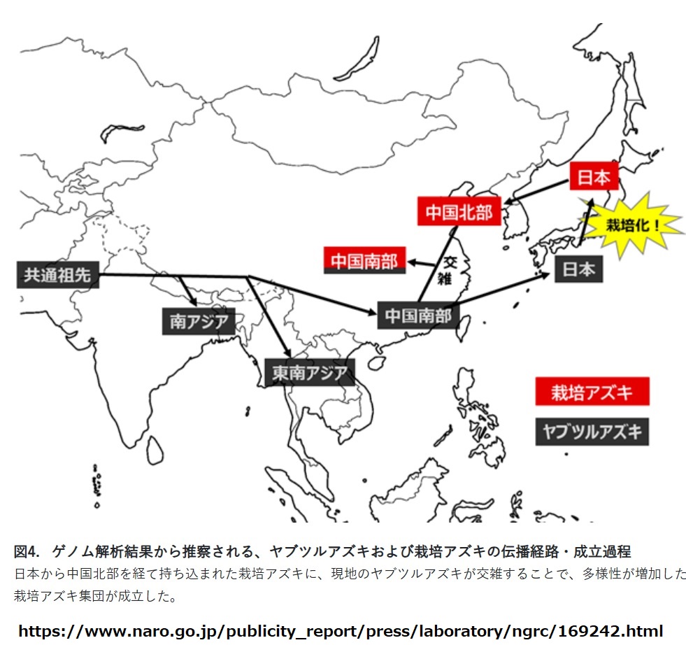 農研機構の5月30日付プレスリリース《(研究成果) アズキの栽培化が日本で始まったことをゲノム解析で明らかに》にある「栽培アズキの伝播経路・成立過程」の図を引用します。西アジアのヤブツルアズキが中国南部に伝わってから日本に到来、栽培化された経路地図です。