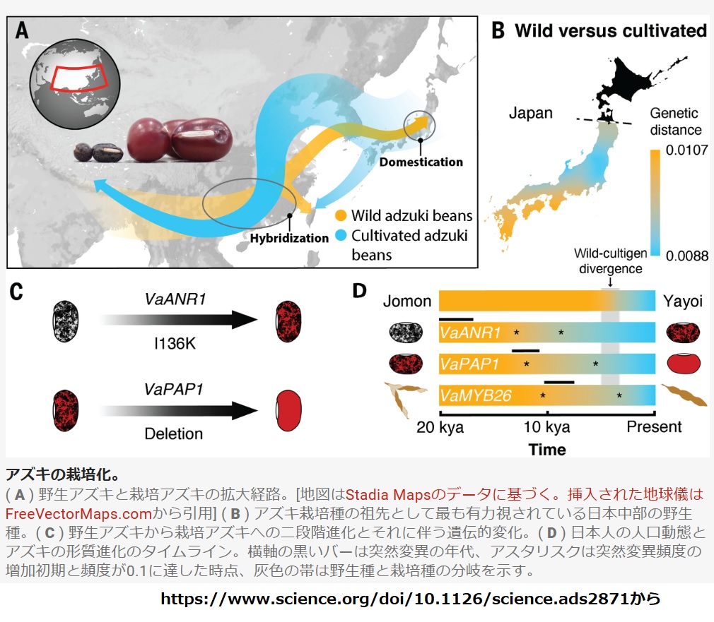 「サイエンス」掲載の論文《日本におけるアズキの単一栽培起源と栽培遺伝子の進化---A single domestication origin of adzuki bean in Japan and the evolution of domestication genes》はこんな結論です。