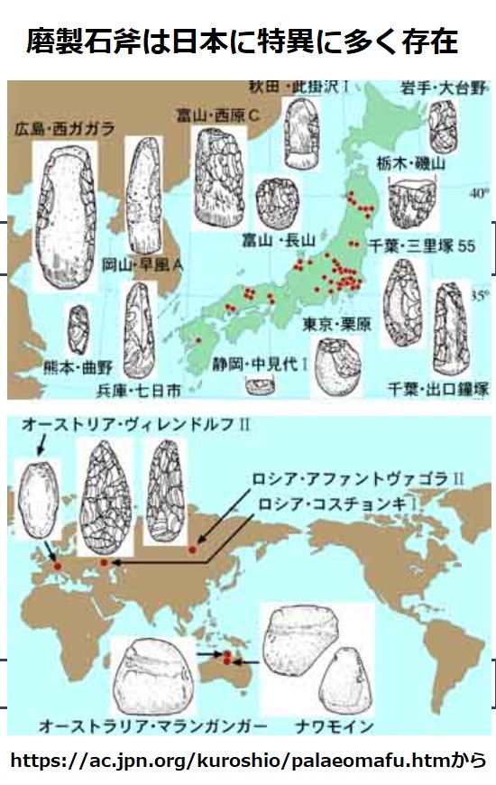 《日本の旧石器文化の磨製石斧は、不思議なことに3〜4万年前に集中し、その後は草創期にならないと出現しない。つまり現在「世界最古」の磨製石斧であり、さらにこの磨製技術は日本で独自に発明された可能性もある》