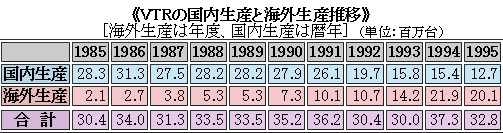 韓国をはじめとしたアジアの新興工業国には部品産業の厚みがない。VTR生産の海外移転が容易でなかった理由である。シェアトップの松下電器は比較的早くから海外で一貫生産を目指したが製品の逆輸入はせず、国内販売品は国内生産で別ものという構え。東芝はマレーシア工場で造らせていた基幹部品の回転ドラムを、国内製に戻して高集積化した半製品にしたりと、試行錯誤を繰り返していた。が、最近になって「チャイナページ」の「'97年4月日系企業中国進出状況」は「東芝はビデオドラムの生産を静岡県・富士工場から大連の子会社『東芝大連有限公司』に全面移管した。このほど富士工場の生産分を合わせて年間生産能力を200万個体制を整えた 」と伝えている。