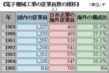 日本電子機械工業会の「電子産業の事務所数と従業員数」を見よう。「海外シフトが活発になるに伴い、1988年にカラーTVで、1994年にVTRで、海外生産が国内生産を台数ベースで上回」った結果がこうなる。