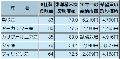 ちょっと古くなるが、資料としての価値が高いので、'92年末に鳥取大農学部主催で開かれた世界各国産コシヒカリの食べ比べ結果を紹介する。最初の数字ふたつは味の機械計測値、右端の価格は参加した農業関係者が試食して付けた値段だ。