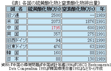 「大気汚染」の項目にある「深刻化する大気汚染」から引用すると「中国は世界第3位のエネルギー消費国です。一次エネルギー源の76%が石炭であるため、石炭を燃焼する際に放出される硫黄酸化物は1795万t(1993年)にも達しています(『中国統計年鑑1994』)。この数字は日本の排出量の約20倍に相当し、世界の総排出量の15%に相当します(表1)。北京、瀋陽、西安、広州、上海などの大都市では硫黄酸化物に関するWHOの基準をすでに超えて」いる状態だ。その「表1」を以下に収録する。