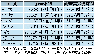 空欄になっている日本の労働時間に、どの調査の数字を使うかで見方は変わる。「平成7年度国民生活白書(要旨)」から読みとると、企業が賃金を支払った分の労働省調査からなら「37.6時間」が入るが、労働者側による総務庁調査ならば「42時間」を超える。実は労働省調査で労働時間減少は下げ止まっていて、少し景気が上向くと残業を増やす傾向が見える。実態に近いと思える後者の数字をベースに、企業行動を変えさせるために労働政策として何らかの手を打つのが当然に思える。時間外労働の賃金単価を所定内の75%増し、あるいは2倍にでもすれば、確実に企業は変わる。労働分配システムに政府が介入するのはまずいが、これは競争にルールを課すだけだ。