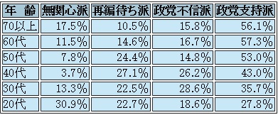 東洋大の三上俊治教授が「政界再編期における政治意識とメディア行動」で、'95年の11、12月に都内で実施したアンケート調査をもとに無党派層の実体を論じている。無党派層と一律に出来ず、「政党不信派」と「無関心派」に加えて、政界変動で乗る便をなくして空港で乗り換え便を待つトランジット客のような「再編待ち派」の3タイプに分かれると分析、「政党支持派」を加えた4グループに有権者を整理している。年齢別、学歴別にみた4タイプの比率グラフは興味深い。「年齢別にみた無党派層のタイプ 」のデータを引用する。