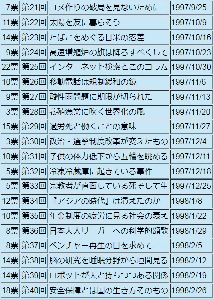 一方的に情報を送り続けること10ヵ月になり、読者ニーズとのずれが生じていないか、チェックするためにも、取り上げ希望テーマを書いていただきました。皆さんの表現は様々ですが、まとめられるものを集約すると、環境問題が一番多く、ついで教育問題、政治家や行政の腐敗、国の財政・年金問題、インターネット、エネルギー問題・原子力発電の収支、地球温暖化、金融ビッグバン、宇宙開発といったところが、複数の方の希望がある項目です。環境問題は昨秋、集中的に取り上げていますが、実践的なことも含めてさらにの希望です。タイムリーにとの要望もありました。こういった項目は私の目が届く範囲が多く、書くきっかけをつかんだら早めに取り上げましょう。