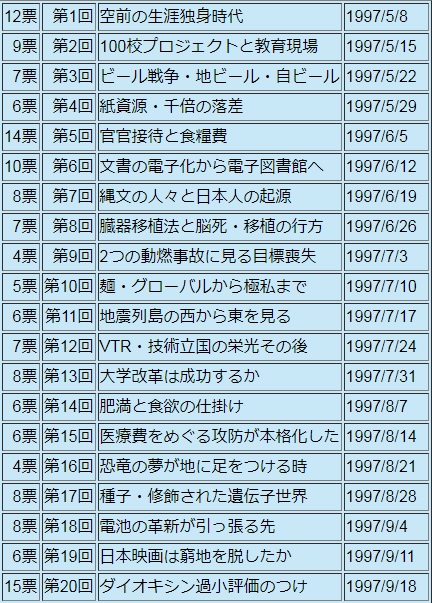 最初に40回のうちで、読者が挙げたお気に入りの回について、以下に集計結果を掲げます。複数回答ですから、分母を60として割り算すると、最高のものが36%、最低のものが5%の名あげ率になっています。