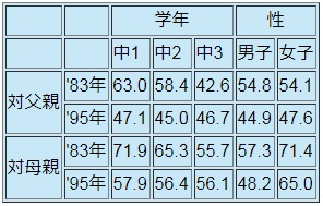 ベネッセ教育研究所が「中学生は変わったのか」で、'83年と'95年、10年余を経て中学生の意識がどう変化したか、神奈川・埼玉・東京の中学1〜3年生1,737人で調べた結果を掲げている。極めて大きな変動が善悪の感覚で示されている。「放置してある他人の自転車に乗る」ことに「とても悪い」と回答した割合は、'83年の64.8%が'95年は47.3%に落ちた。同様に「とても悪い」とした回答は、「自室でタバコをすう」では62.8%から39.5%に、「おつかいにミニバイクを運転していく」が51.1%から25.8%、「かるくパーマをかける」が40.8%から22.1%に、など大幅減である。「次の人が入院したと聞いたら見舞いに行くか」と聞いて、回答の「きっと行く」と「行くかも」を合計したら、親しい友達では8割以上で変化はないが、「同じ学級のふつうの友だち」では62.9%から46.9%へ、「担任の先生」では37.2%から27.9%へ、「校長先生」では15.8%から6.4%へ下がっている。親との関係は重要なものを含んでいるので、表として引用する。以下の数字は「とても」と「かなり」の「うまくいっている」割合の合計である。