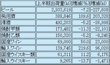 主要酒類の上半期出荷の数字を見たい。日経新聞には出荷量と前年同期比の増減率の一覧しかなかったが、増減量を表計算ソフトに入れて追加してみた。こうすると、種類ごとの出入りの意味がつかみやすい。