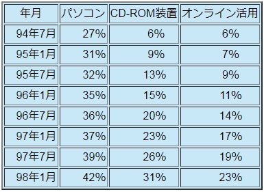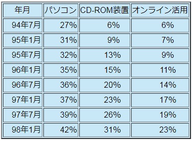 日経メカニカルの「米国の低価格パソコン投入は新規ユーザの獲得に結び付いていない」にあった、米国でのパソコンなどの世帯普及率の表を見ていただこう。