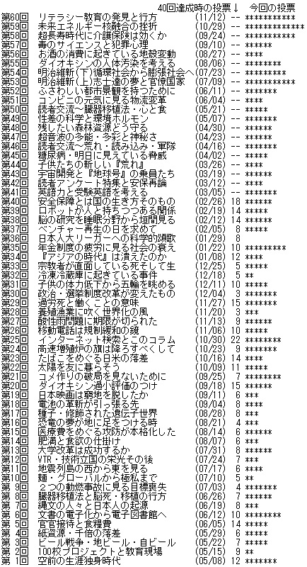 「『1生涯独身時代』を読み愕然、以来全てが血となり肉となっております。EpsonPM2000Cにて毎回裏表印刷、10回分毎にまとめ、A4ファイルも早や6冊が出来上がりました」とメールを寄せていただいた畑さんをはじめ、すべての回を読まれていらっしゃる方が相当ありそうです。その一方で最近、読者になられた方は、当然ながら読まれている回への投票されていると思います。それを勘案しても、このリストは書き手として、いろいろ考えることが出来て、とてもありがたいものです。一口で言えば、時代への懸念が色濃く現れていると思います。