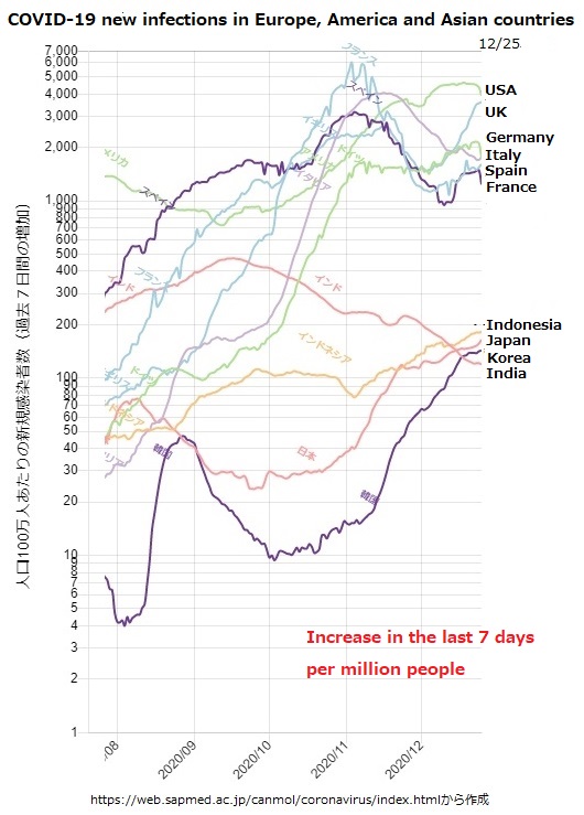 The increase in new coronavirus COVID-19 infections in Japan has not subsided, and is rather accelerating toward the end of the year. Not surprisingly, we only took steps to suspend the "Go To" campaign. The government has no choice but to ask the citizens to refrain from doing so. However, if you look at the world from a broader perspective, there is a clear difference between Asia and Europe and the United States, as epidemics are flourishing on a nationwide scale in each country. Please see the following graph comparing the outbreaks of new cases in Europe, the United States and major Asian countries per million people.